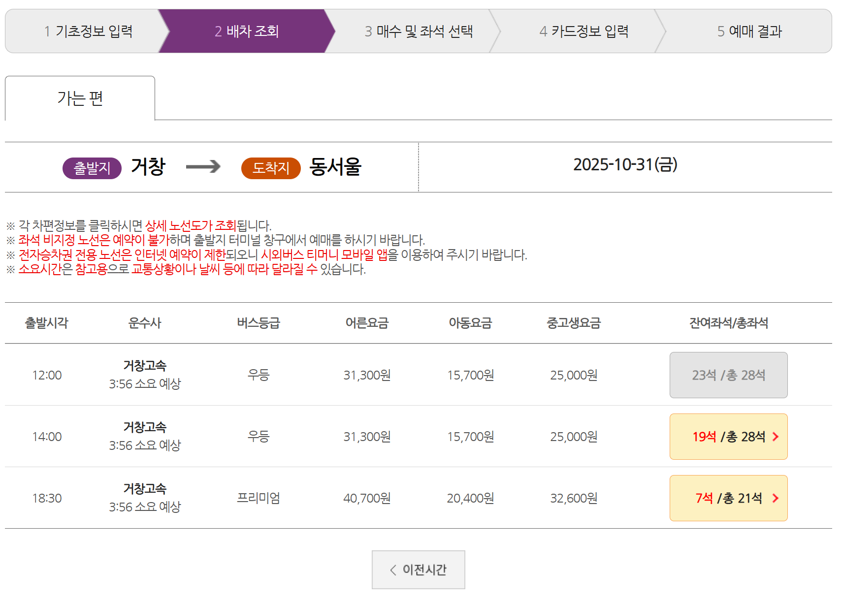 - ② 출발지(거창시외버스터미널), 도착지, 날짜, 인원 입력