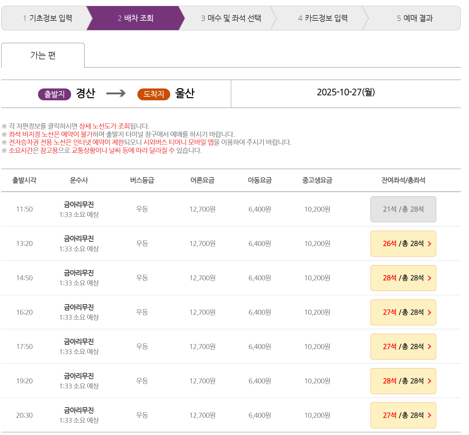 - 운행 간격이 넓은 시간대(오후 늦은 시간 등)는 좌석 선택 폭이 적을 수 있으니 시간 여유를 두고 준비하세요.