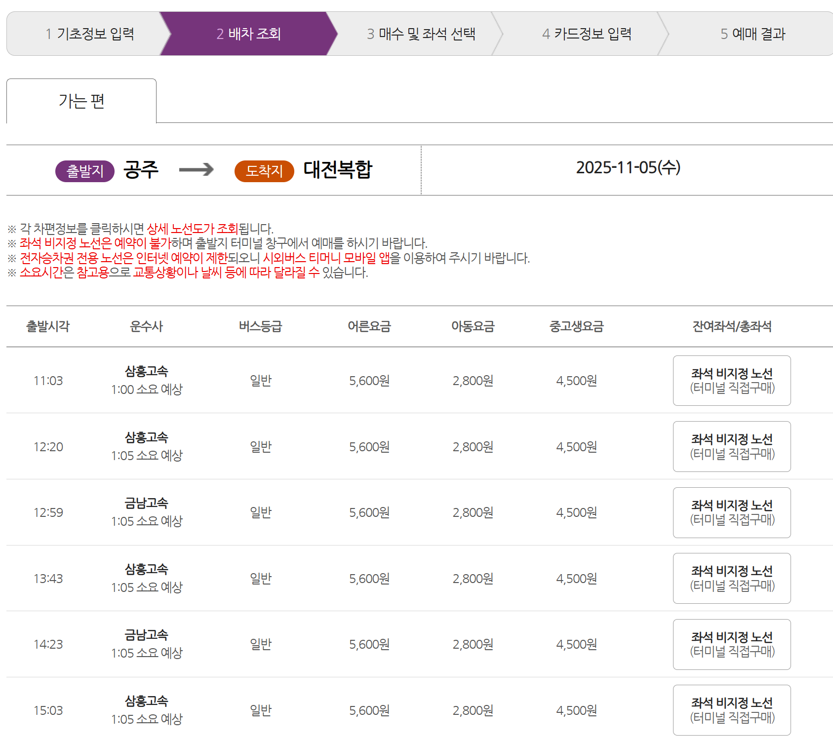 티머니 TxBus 또는 버스타고 앱에서 출발지에 ‘공주(공주종합/공주시외버스)’를 입력하면 해당 날짜 운행편, 잔여좌석, 결제를 진행할 수 있습니다.