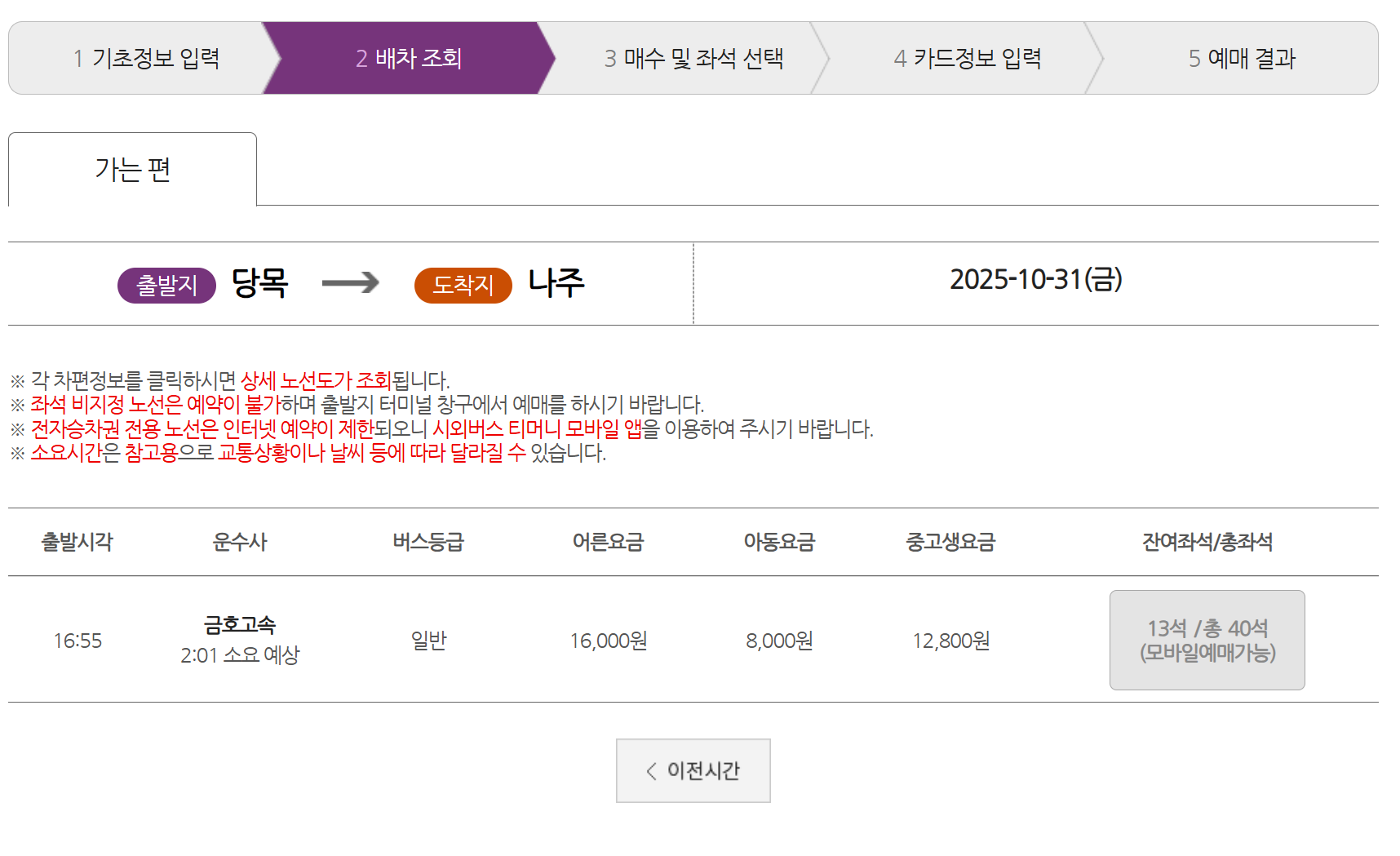 - ② 출발지(당목정류장), 도착지, 날짜, 인원 입력