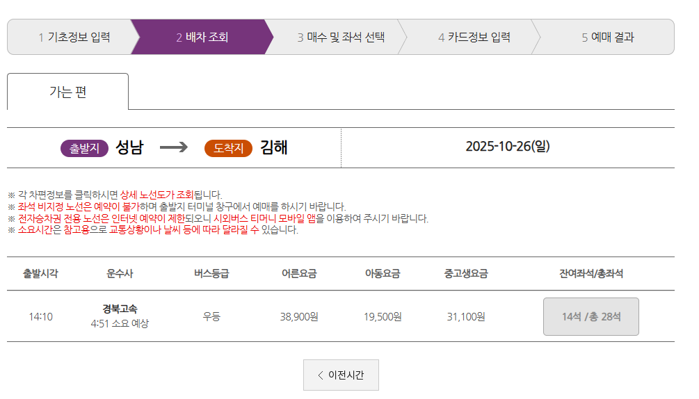 | 예매 경로 | 버스타고, 티머니GO, 공식 사이트 | 모바일 예매 지원 |