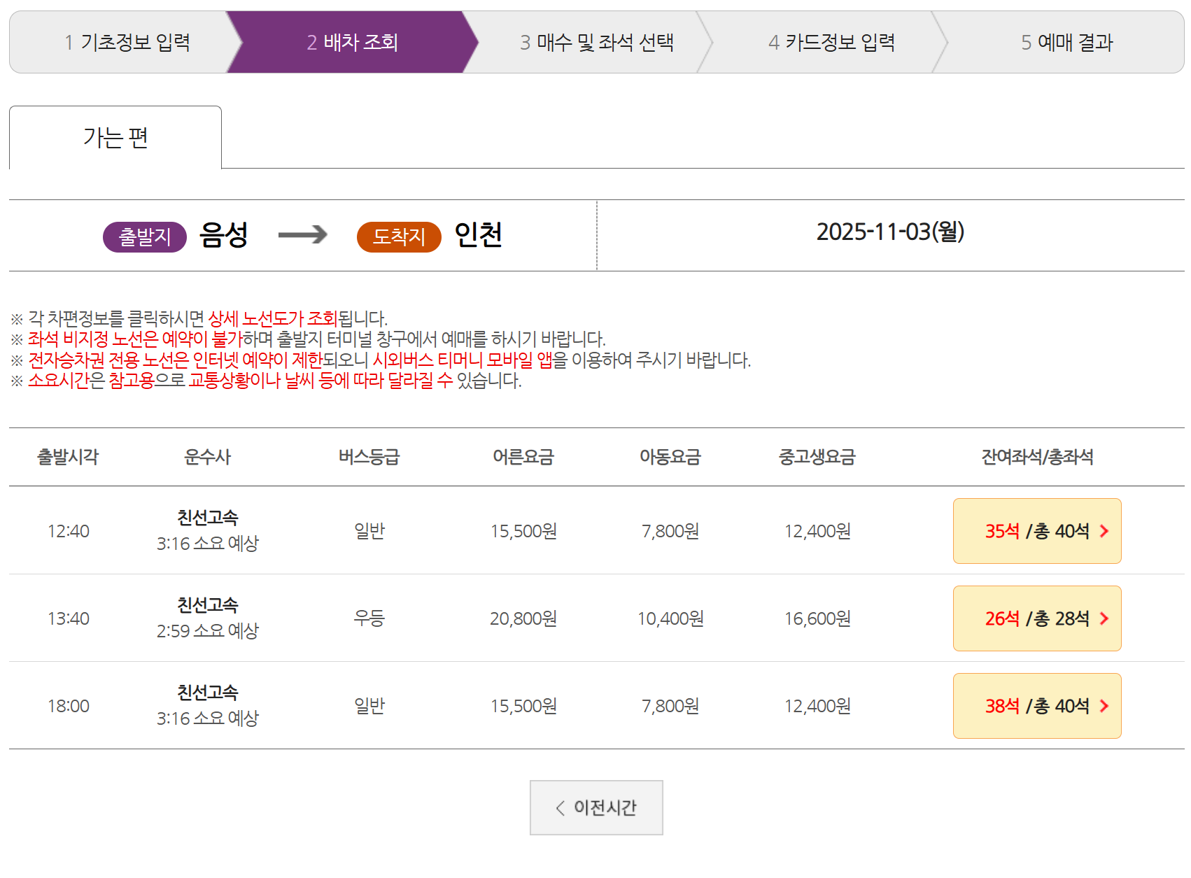 - 사이트 접속 → 출발지 ‘음성공용버스터미널’ 설정